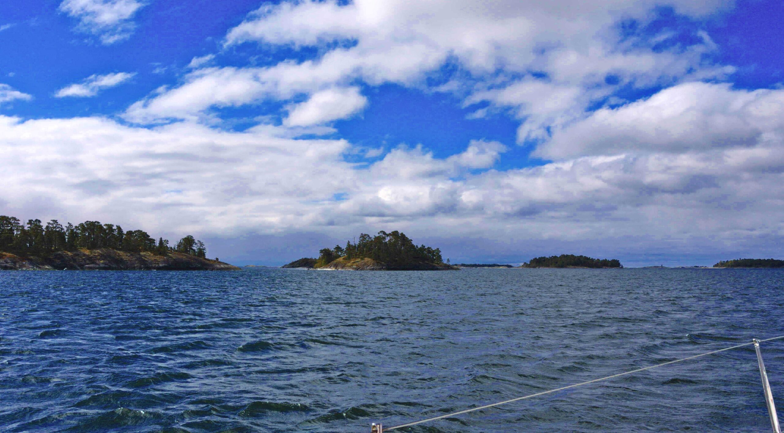 Nach einigen Stunden kommen die ersten Schären in Sicht. Jetzt wird es spannend. Im Vorfeld habe ich vieles gelesen und nett gemeinte Warnungen erhalten, die Navigation ordentlich vorzubereiten und durchzuführen. Ich habe das Display des Plotters vom vielen Durchspielen der Möglichkeiten abgeschleift und tatsächlich erstmals die Wegpunktnavigation bemüht. Sich bei den vielen kleinen Inseln mit der Navigation per Karte zu begnügen, wäre mehr als fahrlässig.