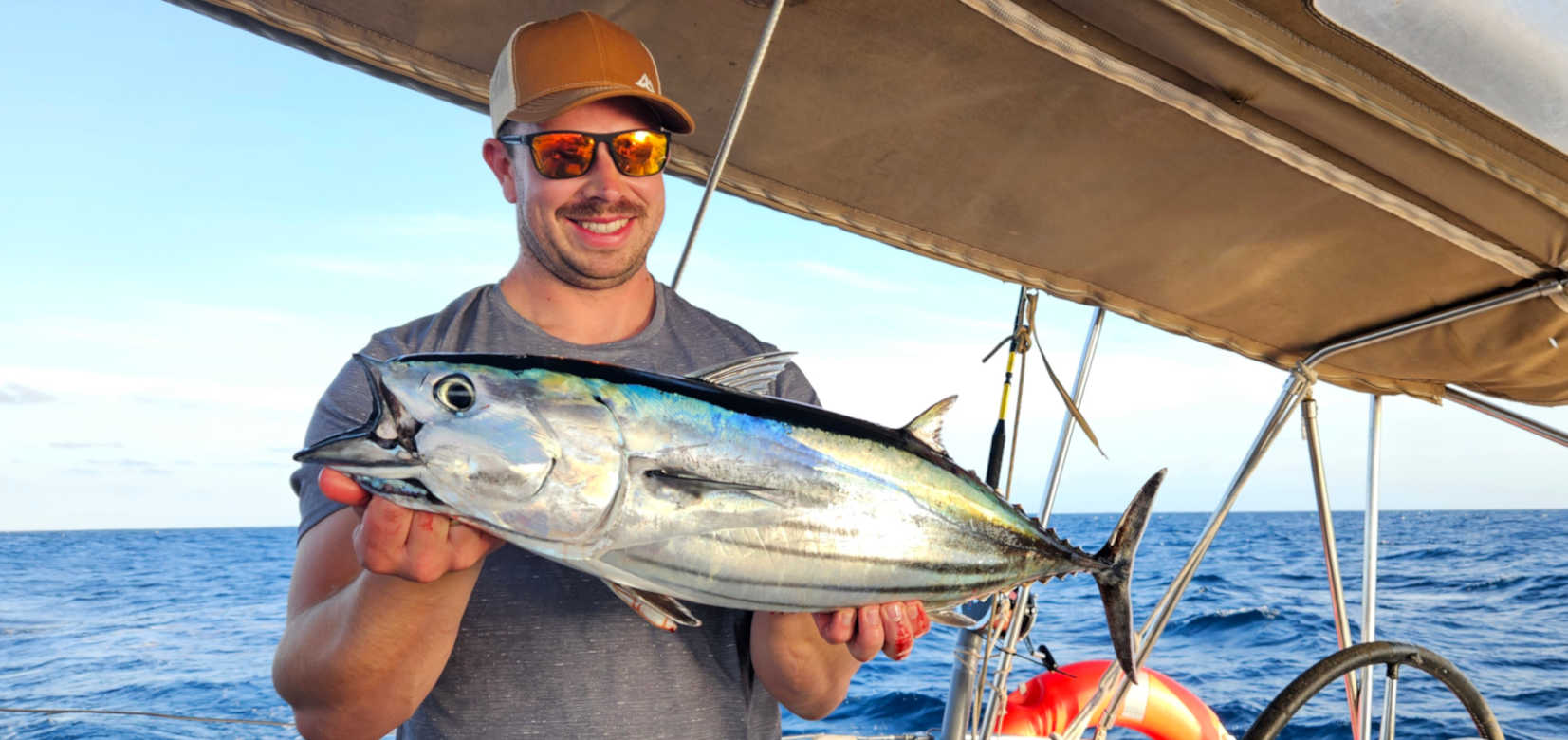 Vor der Auswahl des Ankerplatzes hat Alex seinen großen Moment. Stundenlang sind seine Schleppangeln durchs Wasser gezogen worden, mehr als eine Plastiktüte wurde dabei nicht eingeholt. Und nun hat er einen kapitalen Bonito am Haken. Von diesem Fisch werden wir uns drei Tage ernähren.