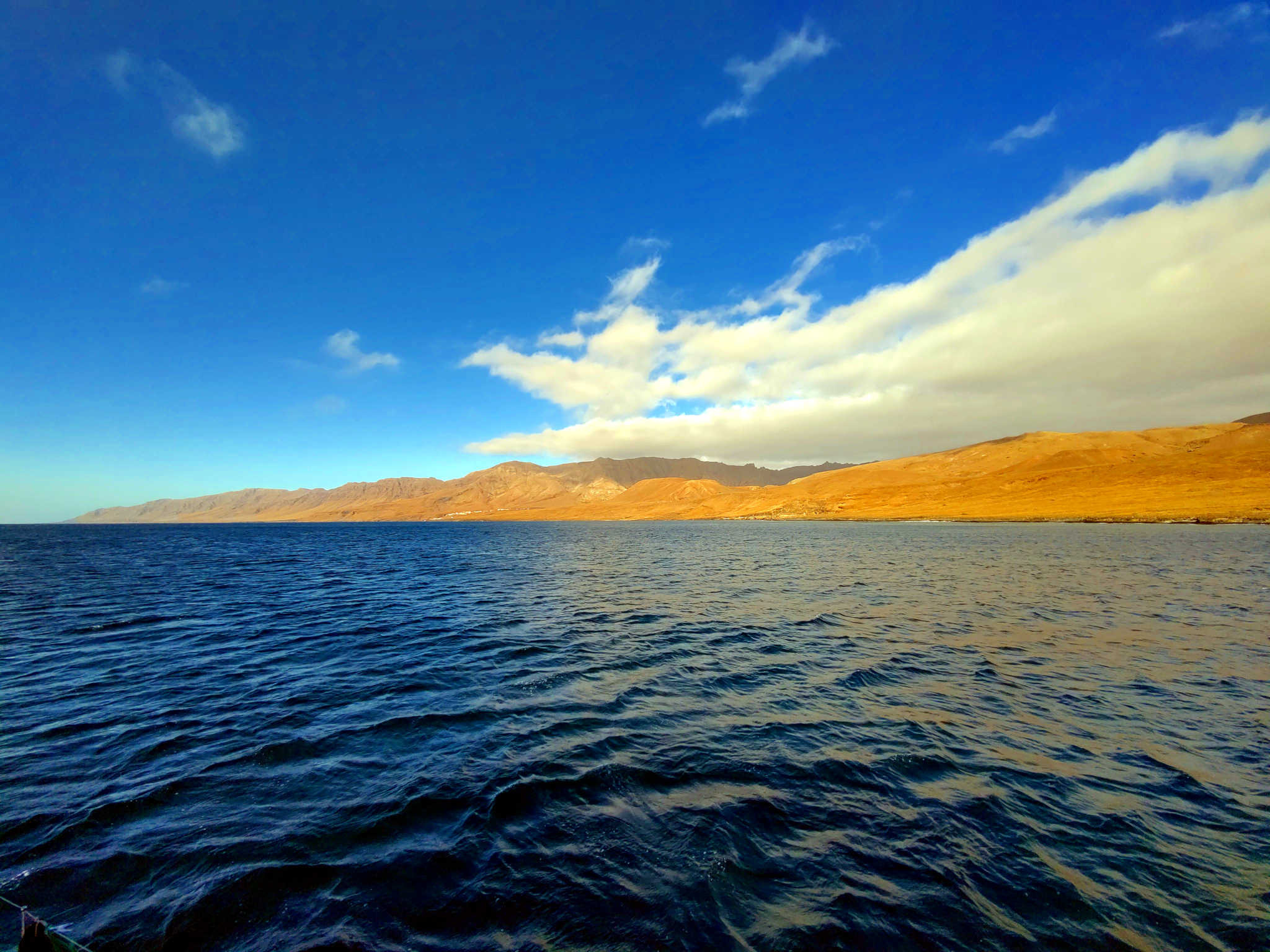 Am nächsten Tag ist unser Etappenziel die Insel Boa Vista. Kurz vor dem Ablegen können wir auf dem Meer Orcas beobachten. Erst das für Wale typische Blasen, also die Wasserfontäne, dann ein kurzes Auftauchen und wir sehen die typischen weißen Wölkchen auf der Haut der Wale. Auch wenn man diesen Tieren mit Respekt begegnet, insbesondere als Segler, hätte ich sie gerne aus näherer Distanz betrachtet.