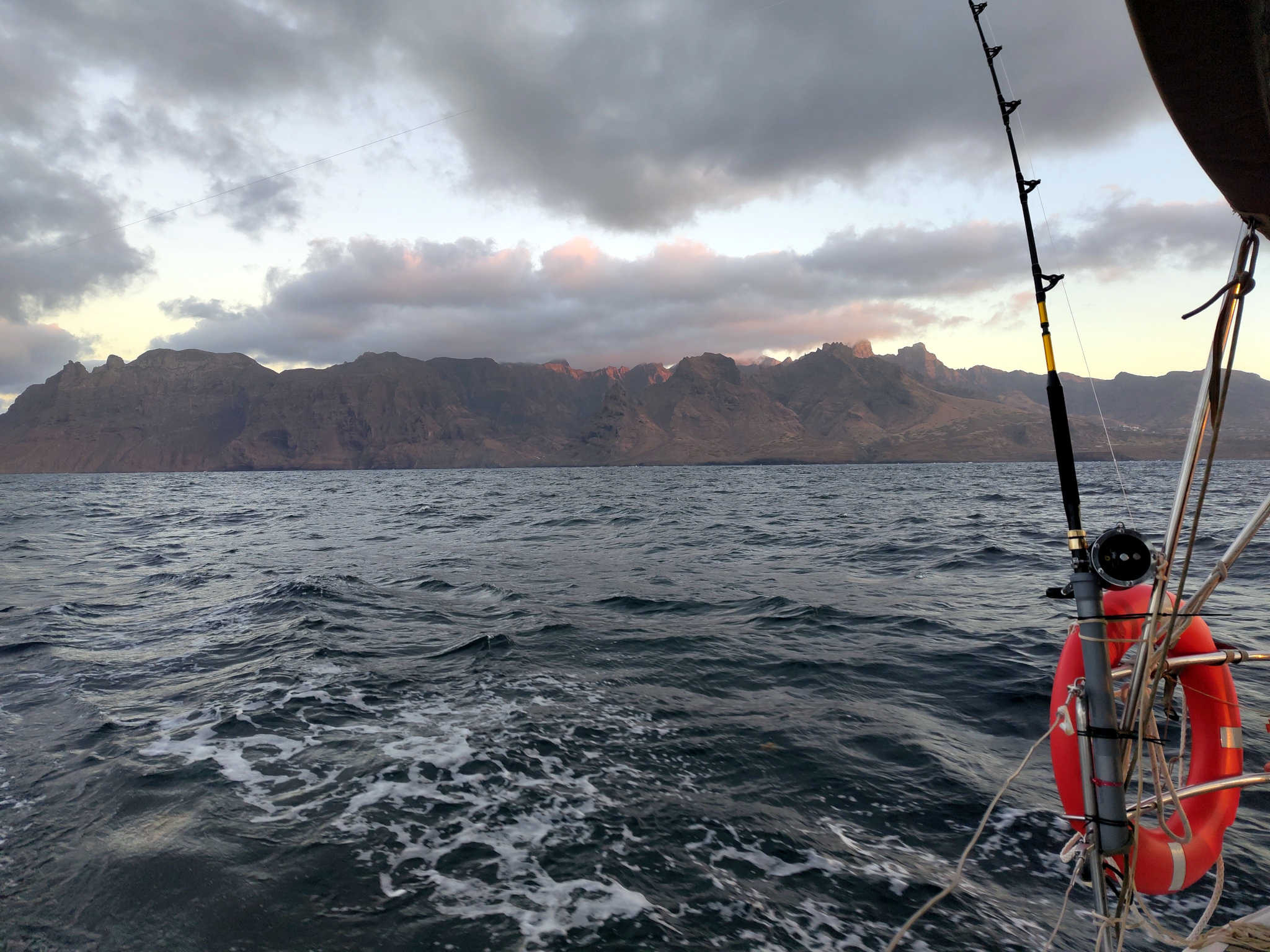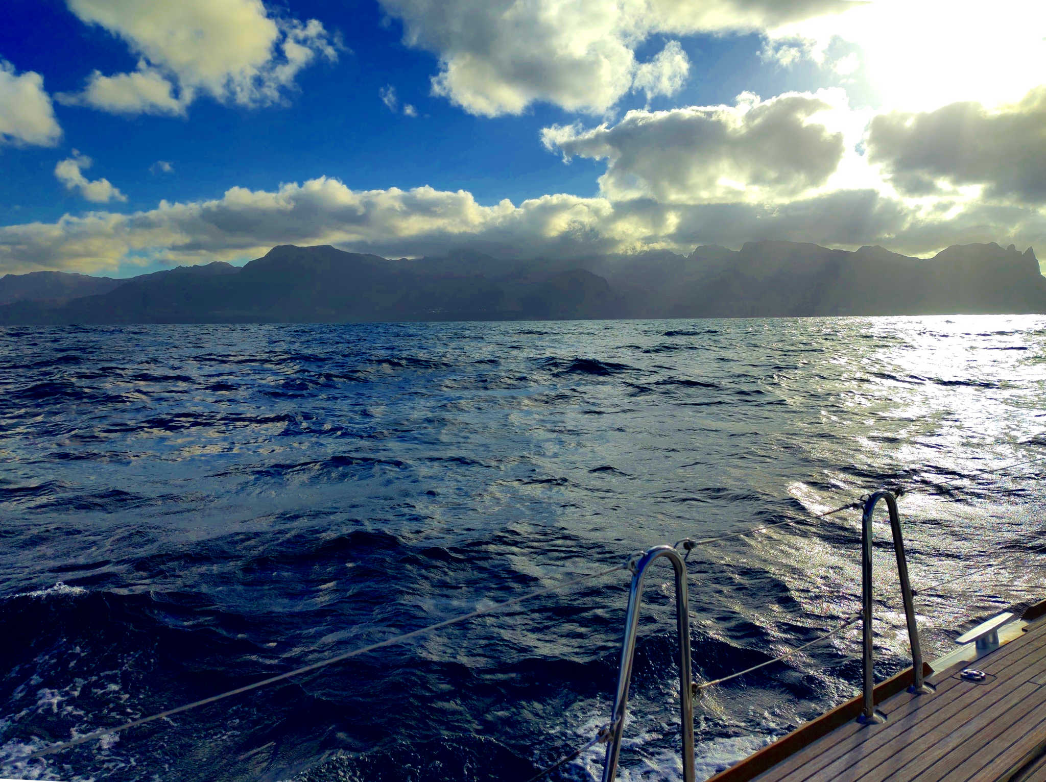 Kurz vor der Küste Santo Antãos haben wir beinahe die Höhe von der Einfahrt nach Mindelo erreicht. Wende einleiten und dann möglichst Richtung Ziel. Das gelingt allerdings überhaupt nicht. Eigentlich segeln wir wieder zurück. Reff 2 war wohl immer noch zu viel, zudem versetzt uns der Strom stark nach Süd. Nachdem Wind und Welle grenzwertig werden, entschließen wir uns, Motorunterstützung anzufordern. Ansonsten wären aus den 2 Seemeilen deutlich mehr geworden.