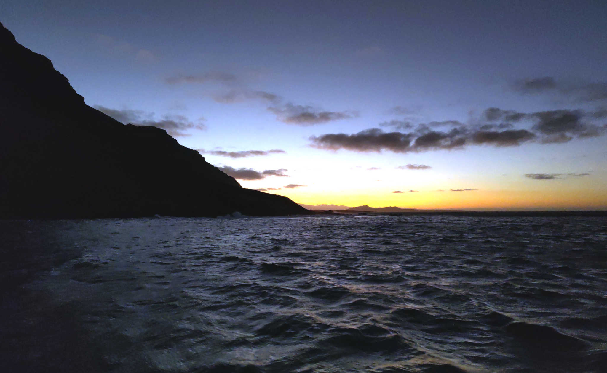 Was also tun… Wieder runter an die Südseite von Nicolau und nach Tarrafal? Dies ist die kürzeste Option, aber die Strecke morgen wird dafür umso länger. Also einigen wir uns nach einer längeren Absprache auf einen Ankerplatz im vermeintlichen Schutz der Ilhéu Branco. Am westlichen Ende von São Nicolau brist der Wind ordentlich auf, die letzten 10 Seemeilen sollten wir schnell absolvieren. Die Sonne geht unter, und der Wind nimmt immer mehr zu. Da haben wir wieder unsere 6 Beaufort mit einigen Böen. Auf achterlichen Kurs müssen wir die Flachpassage zwischen Ilhéu Branco und der Ilhéu Razo passieren. Der Grund des Meeres baut sich an dieser Stelle von eben noch 2.000 Meter auf nur noch 20 Meter auf. Dies macht sich deutlich an den Wellenbergen bemerkbar, die David konzentriert absurfen muss.