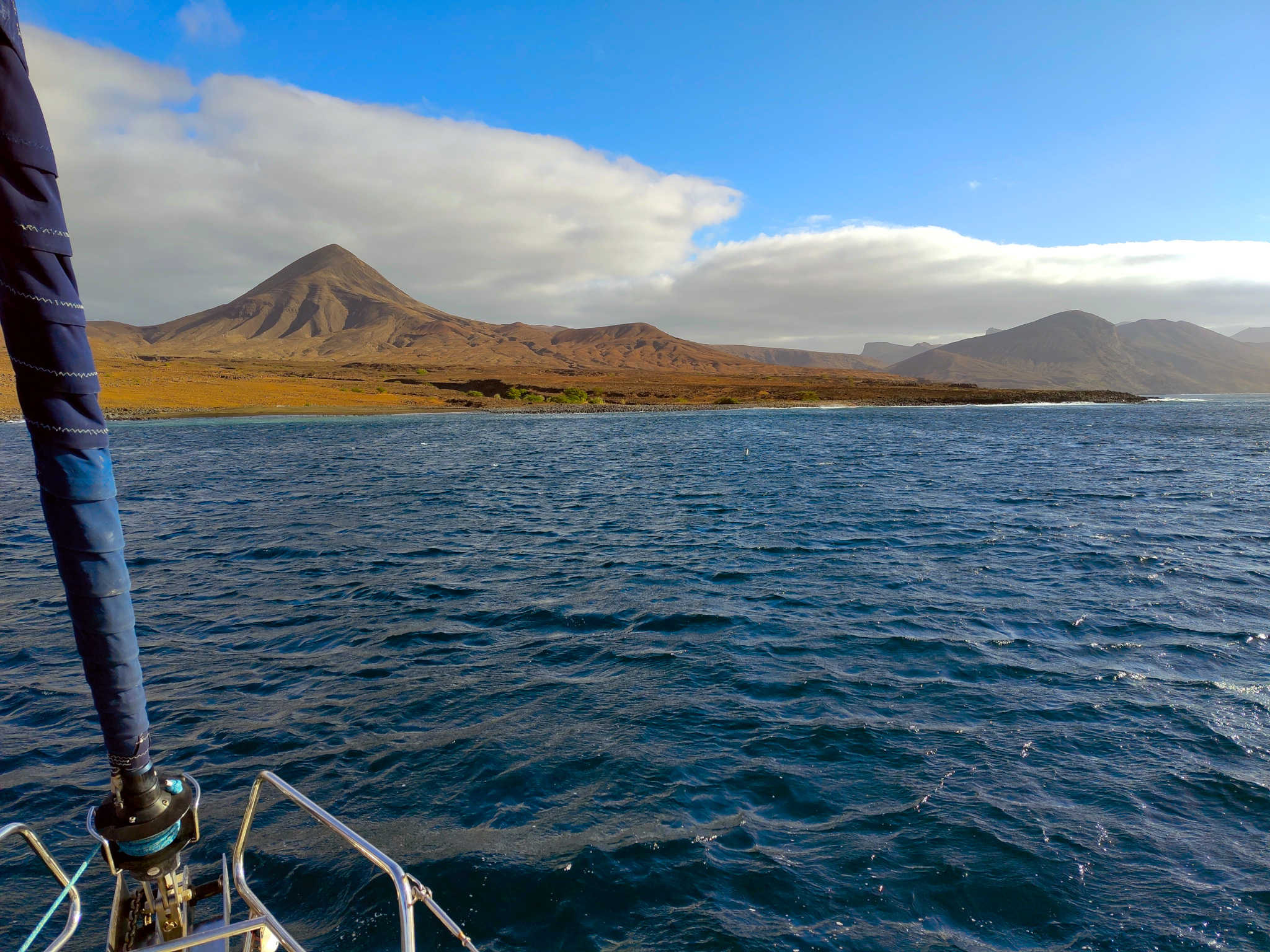 Mit ordentlich Speed steuern wir zu unserem Ziel, ein Halbwindkurs, der unsere SY Prosecco ordentlich beschleunigt. Viel schneller als kalkuliert segeln wir an der Südseite von São Vincente entlang, bis zu der Meerenge zwischen eben dieser Insel und Santo Antão. Wir sehen schon die weißen Schaumspitzen, die die Wellen in dieser Düse kleiden. Und nach kurzer Windpause geht es dann so richtig los, Kurs gegenan.
