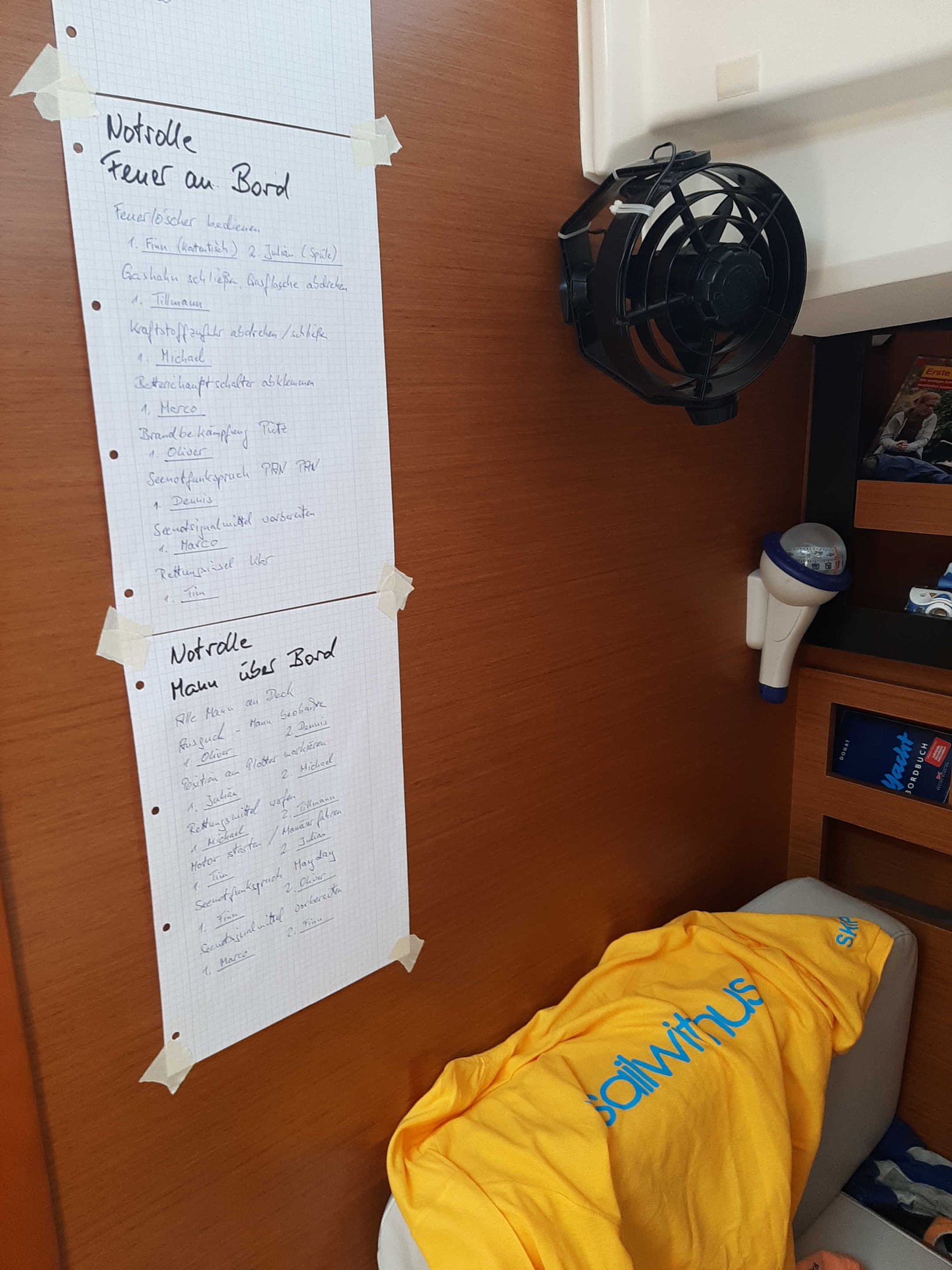 Im Vorgespräch haben wir die Vorkenntnisse und Erwartungen abgeklopft. Dass man die praktische vor der theoretischen Prüfung absolvieren kann, hatte mich gewundert, welche Nachteile dies birgt, werde ich noch aufzeigen. Zudem waren bei einigen Teilnehmern die vorgeschriebenen 300 Seemeilen noch nicht erfüllt. Keine leichte Aufgabe, die fehlenden Meilen einzufahren und dabei noch ausreichend Zeit in Hafen- und Mob (Person über Bord)-Übungen zu investieren.