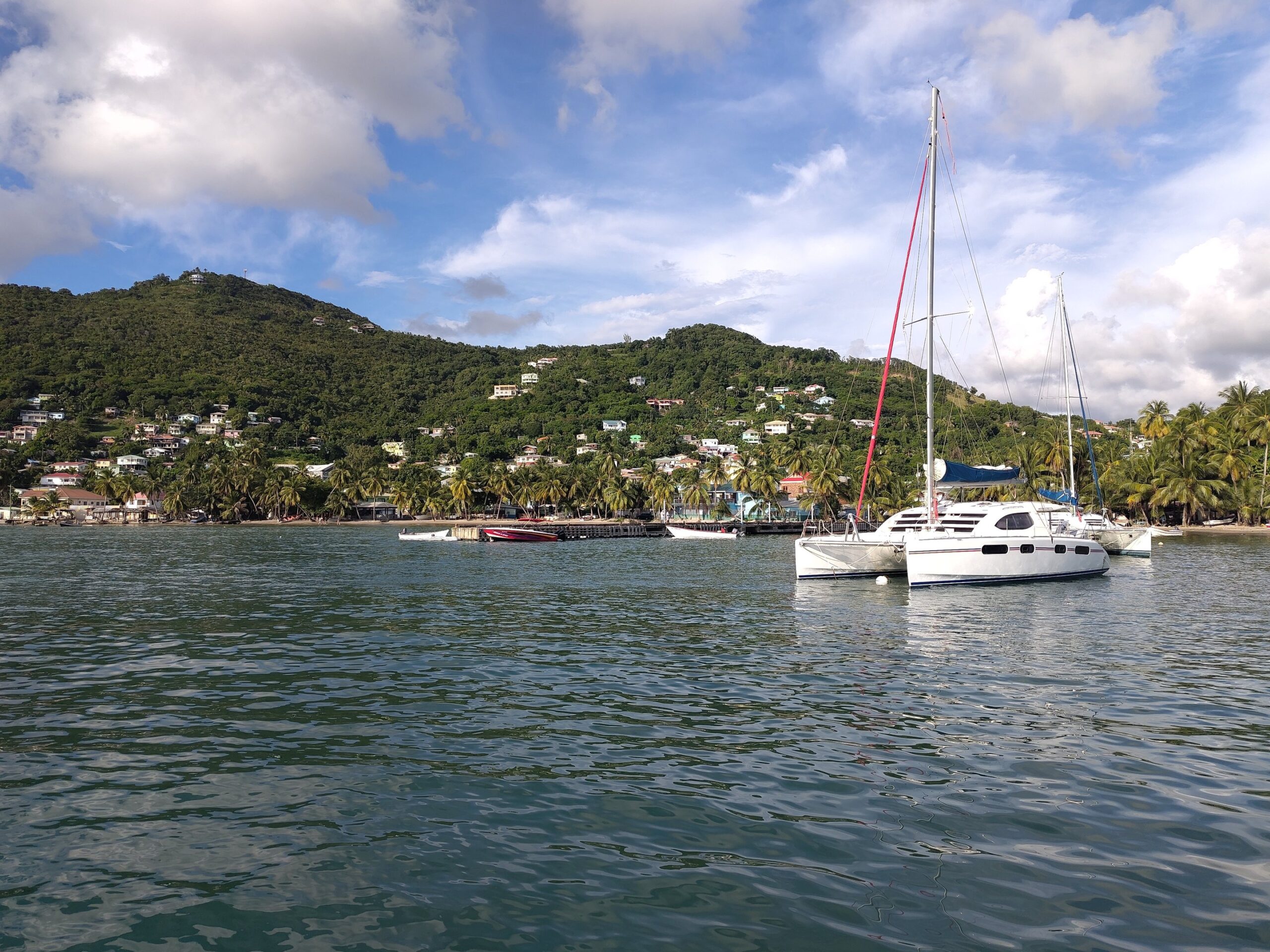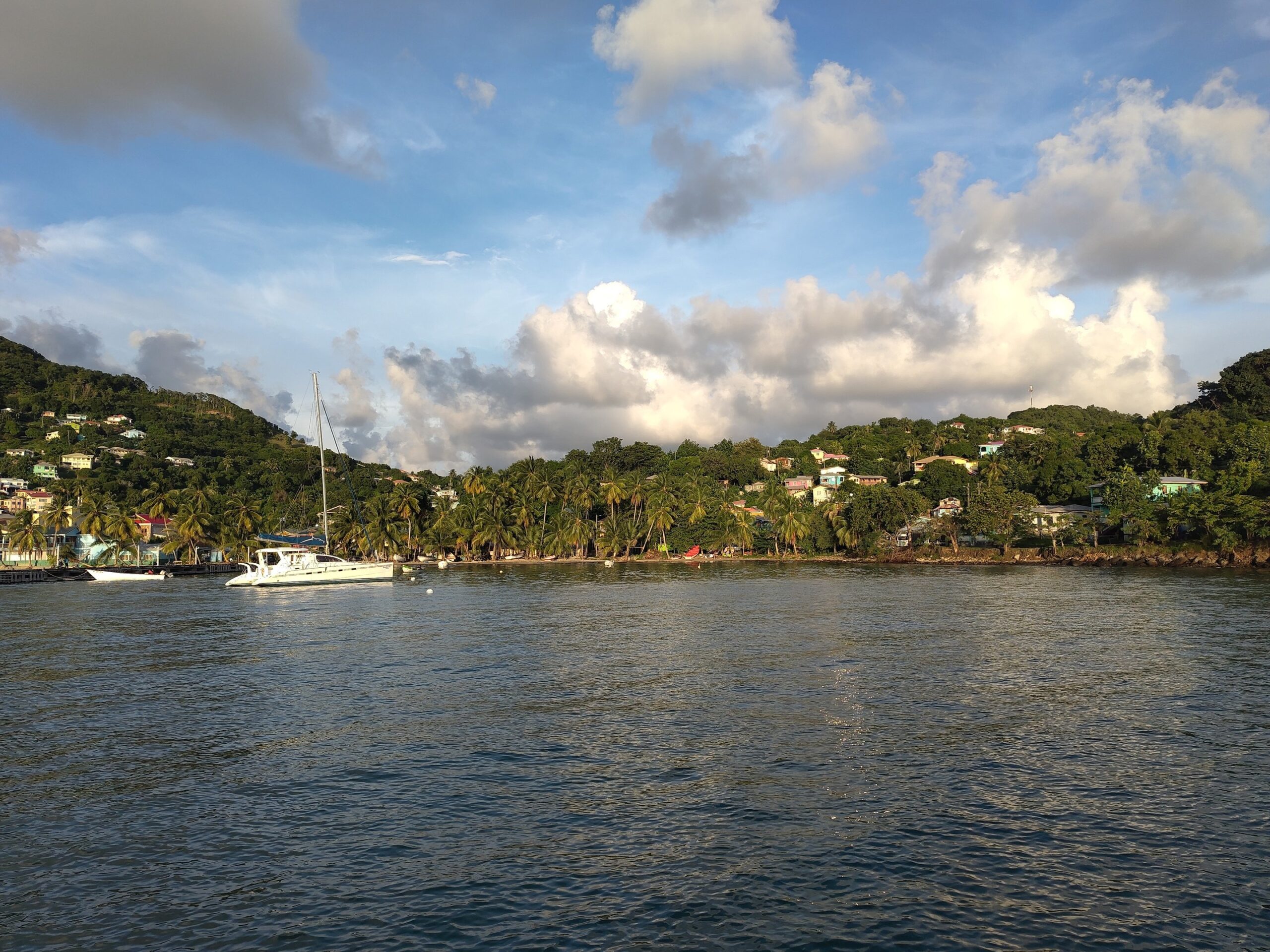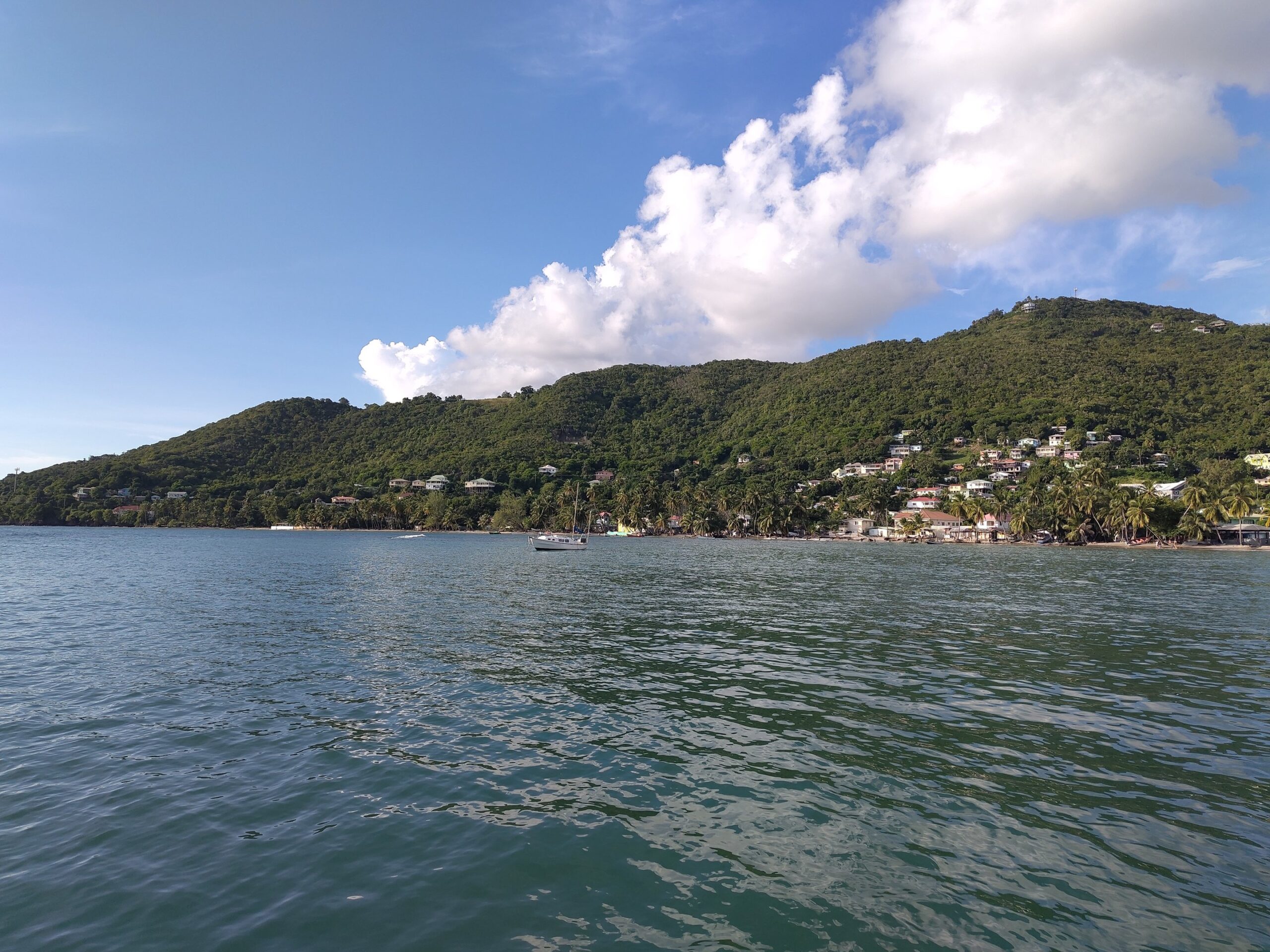 Nach einer Nacht vor Anker, wiederum ohne Einklarieren und einigen zähen Verhandlungen mit einem „schwimmenden Händler“, der noch einige Souvenirs absetzen kann, steht der letzte Tag der Reise an. Bevor wir die Yacht in Le Marin festmachen, soll es noch ein Strand zum Schwimmen sein. Wir lassen St. Lucia am frühen Morgen hinter uns, nachdem wir die Dreimeilen-Zone überschritten haben, stellt sich bei mir Erleichterung ein. Der Wind reicht leider noch nicht zum Segeln, nur beim Durchzug einer der mächtigen Regenwolken brist es auf, allerdings mit schnell wechselnden Richtungen. Die Segel bleiben unten.
