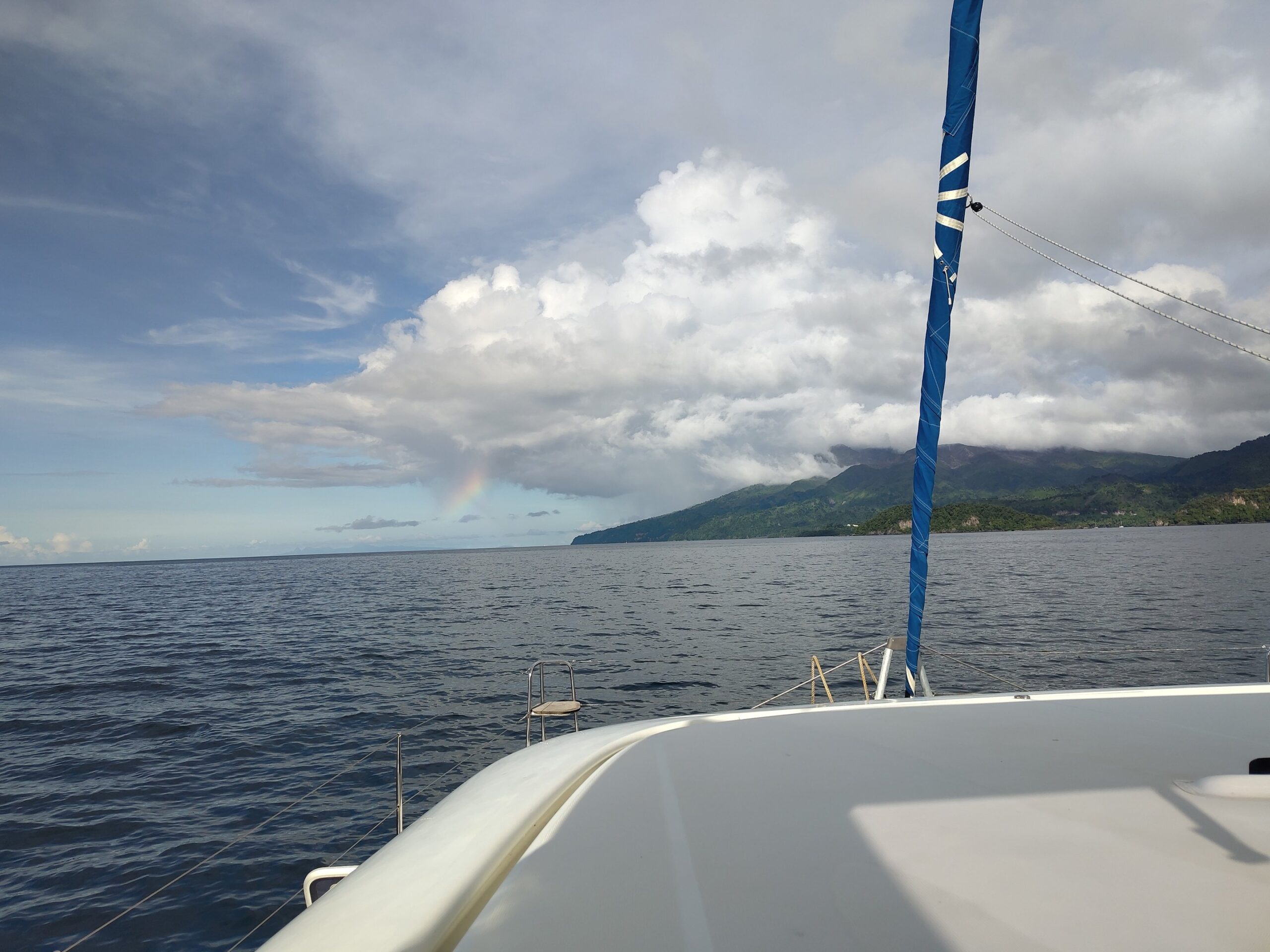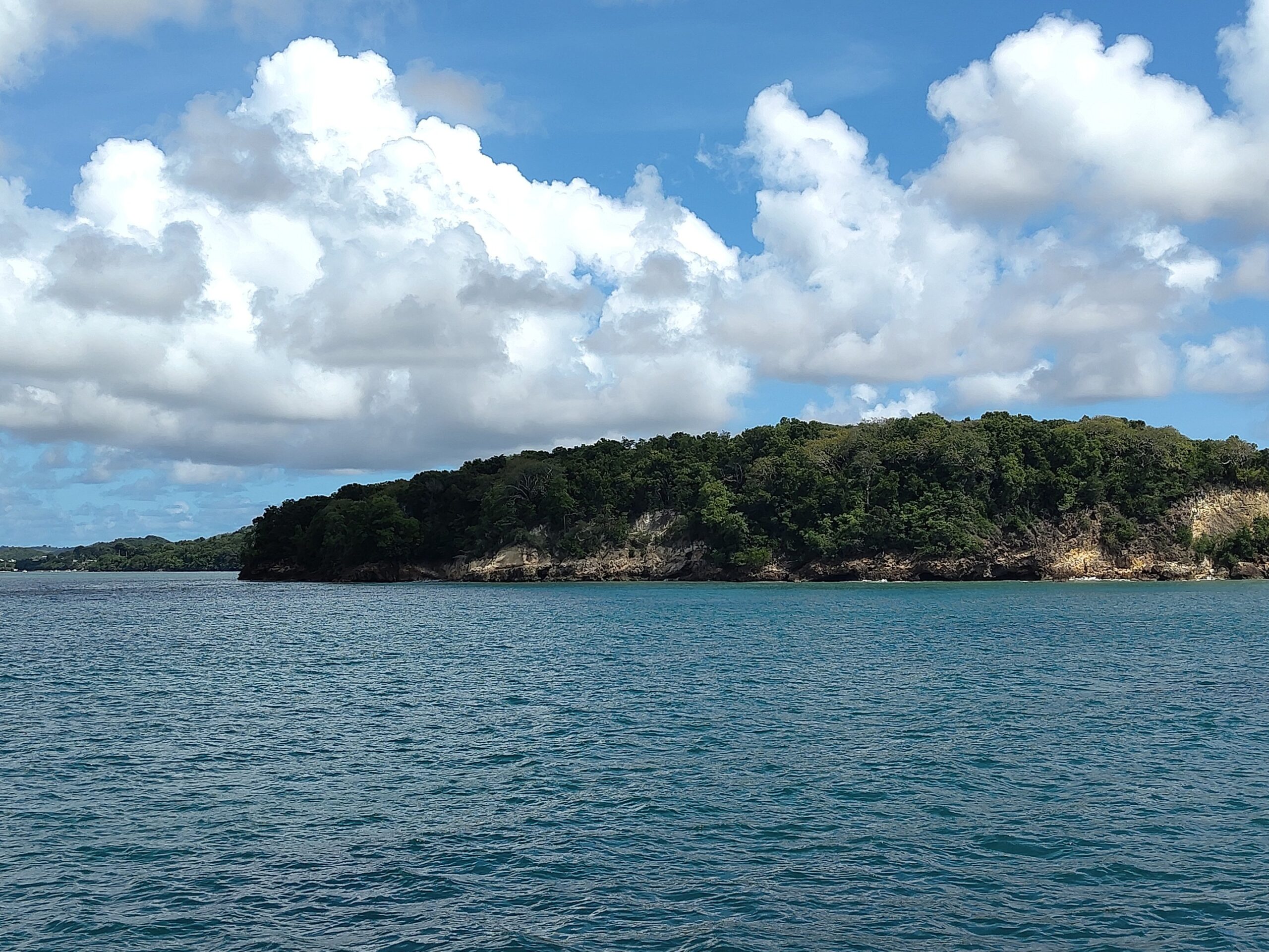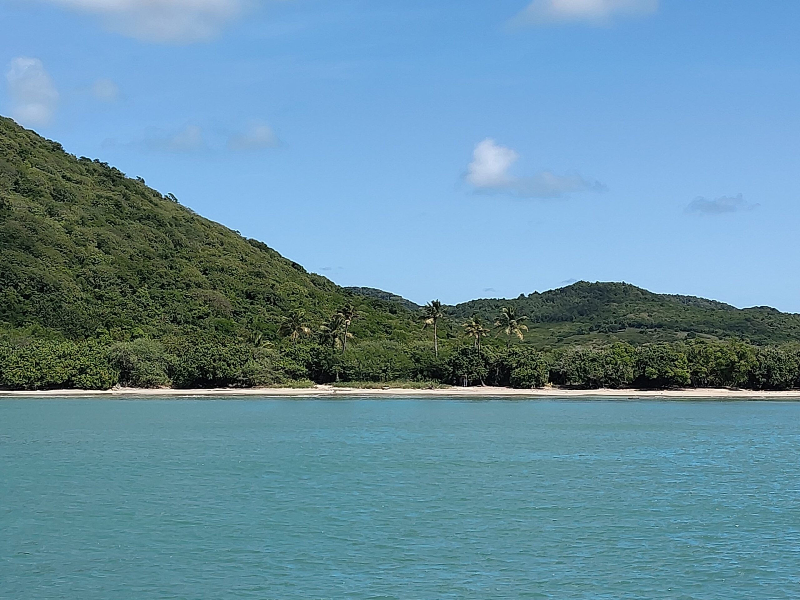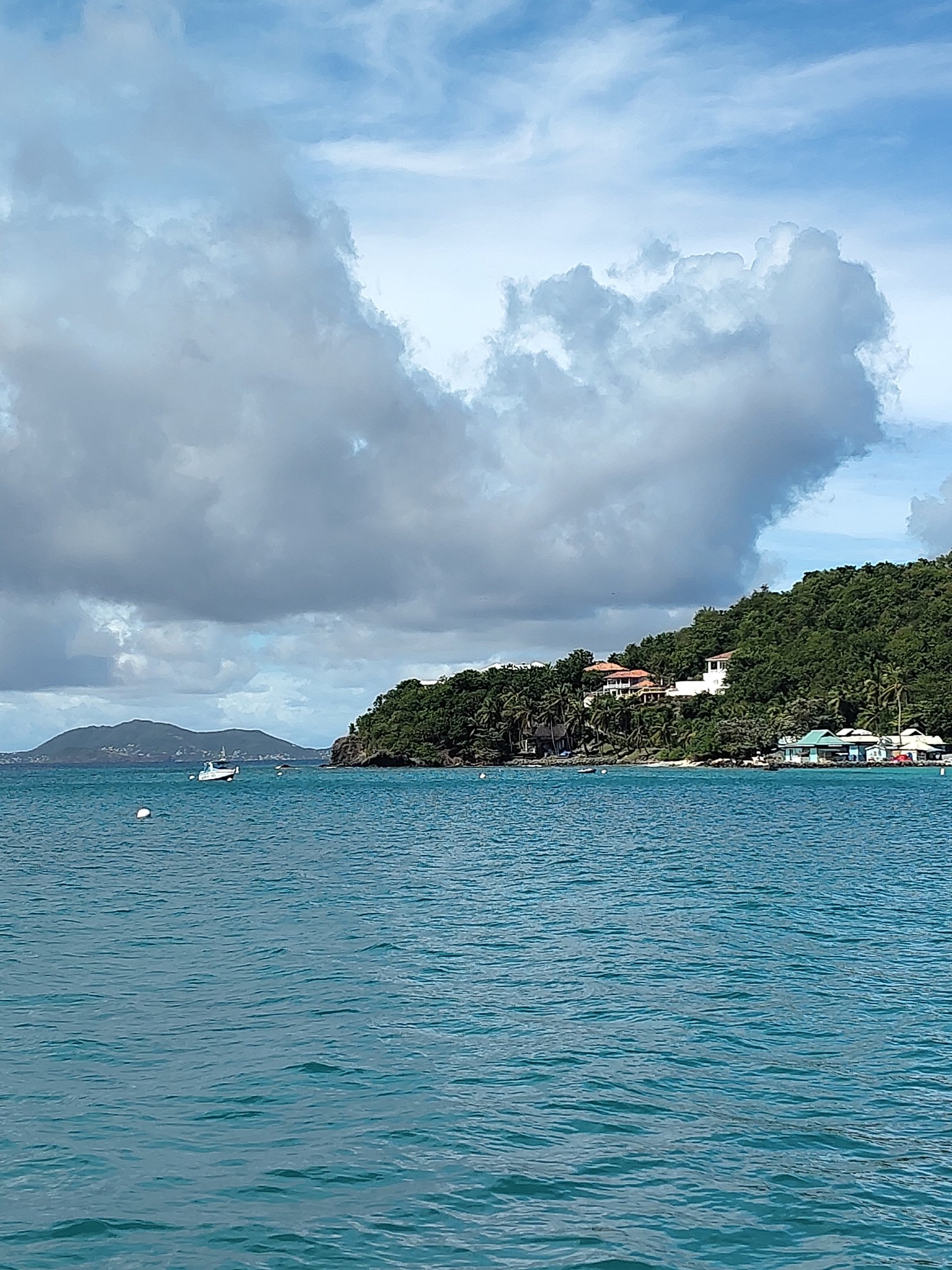 Nach einer Nacht vor Anker, wiederum ohne Einklarieren und einigen zähen Verhandlungen mit einem „schwimmenden Händler“, der noch einige Souvenirs absetzen kann, steht der letzte Tag der Reise an. Bevor wir die Yacht in Le Marin festmachen, soll es noch ein Strand zum Schwimmen sein. Wir lassen St. Lucia am frühen Morgen hinter uns, nachdem wir die Dreimeilen-Zone überschritten haben, stellt sich bei mir Erleichterung ein. Der Wind reicht leider noch nicht zum Segeln, nur beim Durchzug einer der mächtigen Regenwolken brist es auf, allerdings mit schnell wechselnden Richtungen. Die Segel bleiben unten.