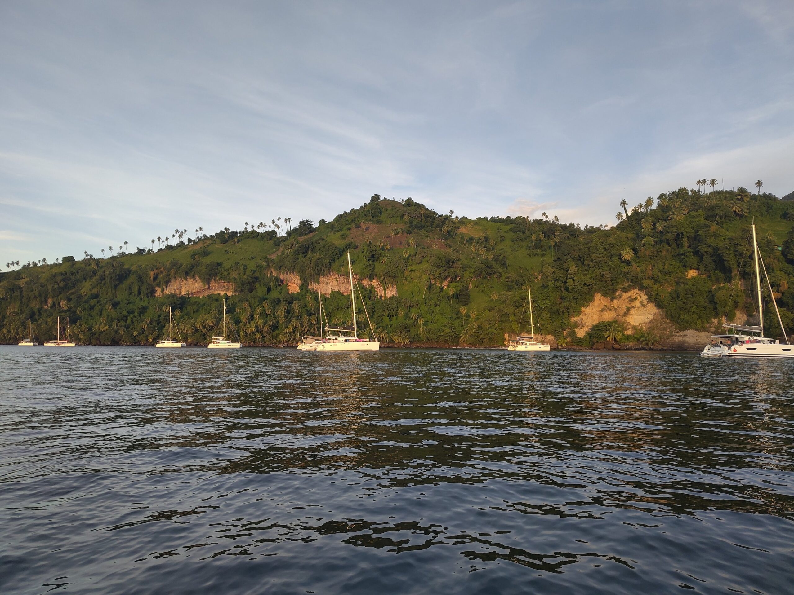 Diesmal ist wieder ein Ankermanöver fällig, nachdem wir die meiste Zeit an Bojen festgemacht haben. Einige Yachten liegen bereits vor Anker, wir suchen uns zwei mögliche Lücken aus, an dem wir unser Manöver ausführen wollen. Allerdings kommen an Backbord zwei weitere Yachten, die uns unsere Auswahl streitig machen könnten. Nachdem der erste Einrümpfer mit großer Fahrt in die Bucht einläuft, erhöhen auch wir unser Tempo, um nicht auch dem dahinter fahrenden Katamaran den Platz zu überlassen. Es gelingt uns, einen mit ausreichend Abstand versehenen Spot anzufahren und lassen den Anker im nördlichen Teil der Bay fallen, der zum Ankern in Navily empfohlen wird. Noch ordentlich Kette gelegt, passt. Nachteil an diesem Platz: Der Kai zum Ausklarieren ist sehr weit weg. Wird das unser stotternder Dinghi-Außenborder schaffen? Zudem steht ordentlich Welle am Strand. Von einem anderen Skipper habe ich gehört, dass man versucht hat, dort anzulanden, aber schön durchgespült wurde. Auf dieses Experiment möchte ich mich nicht einlassen.