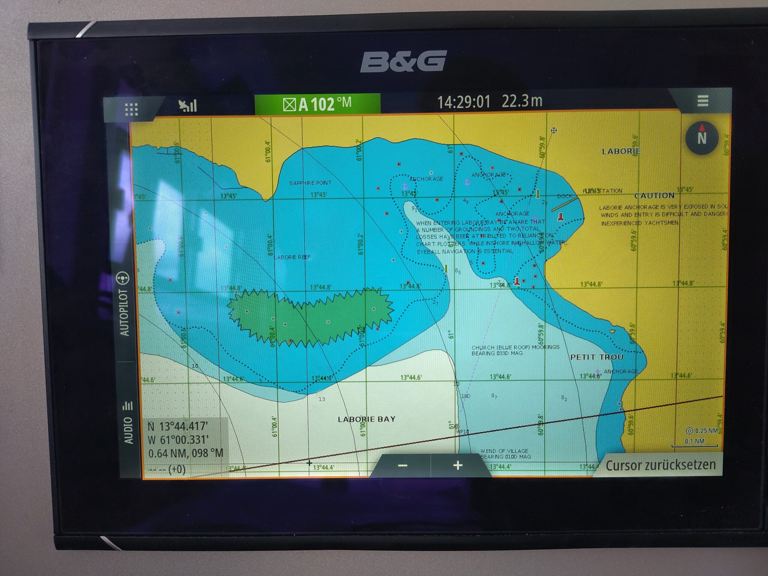 Der Blick auf die Karte verrät, dass auch die Einfahrt in die Laborie Bay äußerst tückisch ist. Das Kartenmaterial an Bord hat seine Halbwertzeit längst überschritten, dem Kartenplotter kann man auch nicht bedingungslos vertrauen – bei der Einfahrt Marigot Bay habe ich schon gesehen, dass uns der Plotter an Land gezaubert hat und wir eine Ungenauigkeit von mehreren zehn Metern einkalkulieren müssen. So kommen wir nicht in diese Bucht. Zum Glück haben nette Segler in der App Navily, auf die ich gerne zur Vorbereitung auf einen geeigneten Ankerplatz zurückgreife, den folgenden Kontakt hinterlegt, den ich nur wärmstens empfehlen kann.