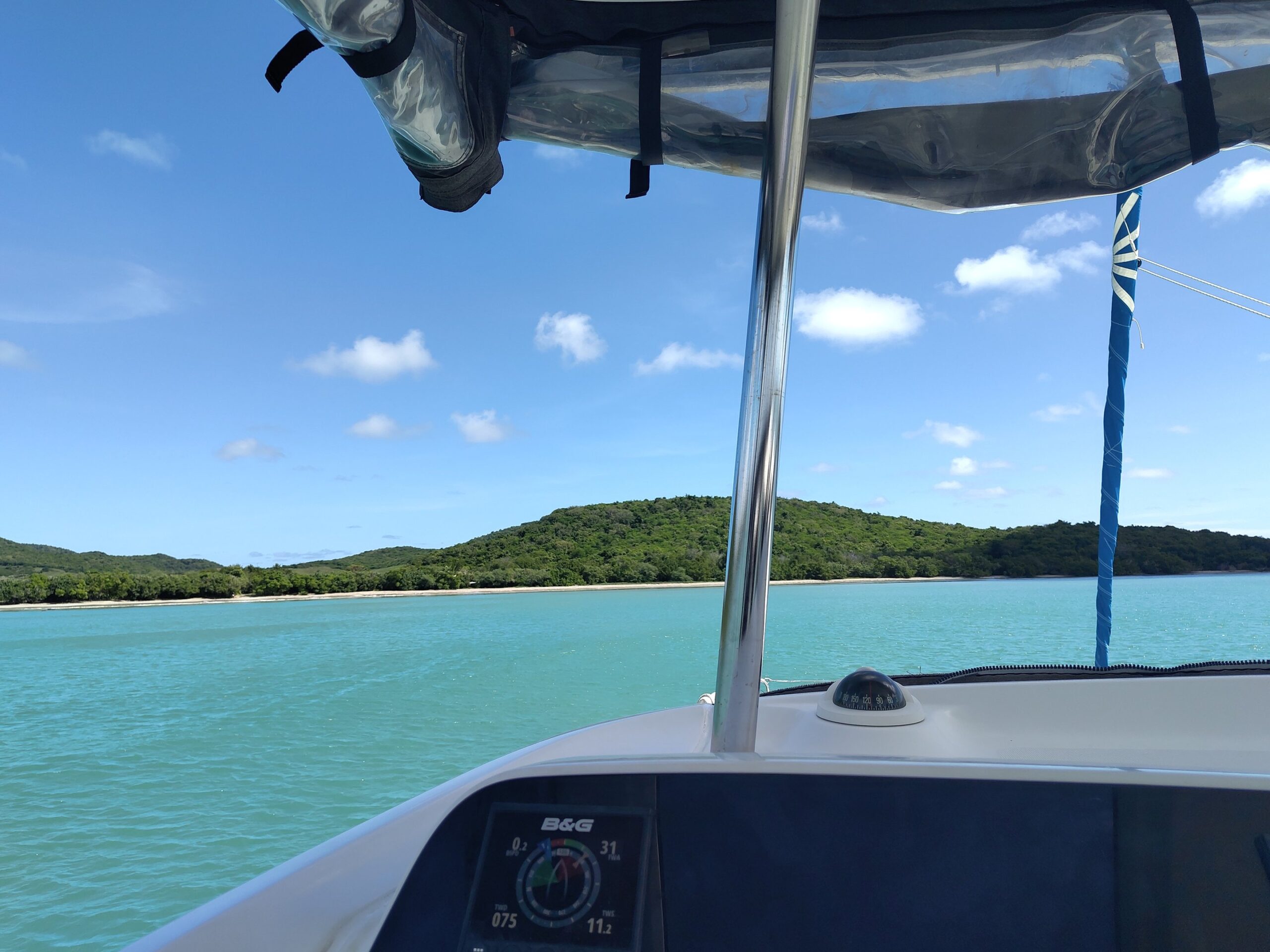 Die Grande Anse de Salines ist laut Kartenplotter nicht zum Ankern freigegeben. Wir haben bei der Vorbeifahrt dort auch keine Yachten vor Anker liegen sehen. Zudem ist es zu weit für einen kurzen Abstecher. Keine Yacht befindet sich auch in der Anse Meunier gleich südlich hinter dem Ponte Dunkerque. Interessant, den hätte ich eher an der französischen Nordseeküste im Département du Nord vermutet. Unsere Karten helfen uns bei der Wassertiefe nicht weiter, zudem scheint es in dieser Bucht möglich zu sein, auf Sandbänke zu treffen. Unser Steuermann fährt forsch immer näher an den Strand, bei angezeigter Wassertiefe von 1,7m bitte ich darum, das Boot zu stoppen und lasse den Anker fallen. Sand wirbelt auf, der Tiefenmesser kann nicht mehr arbeiten und zeigt nur noch drei Striche an. Hoffentlich geht das gut. Zumindest ist der Platz, sagen wir, exzeptionell. Aber wir sind in der großen Bucht allein und die Schwimmer innerhalb der Crew können sich hier verwirklichen.