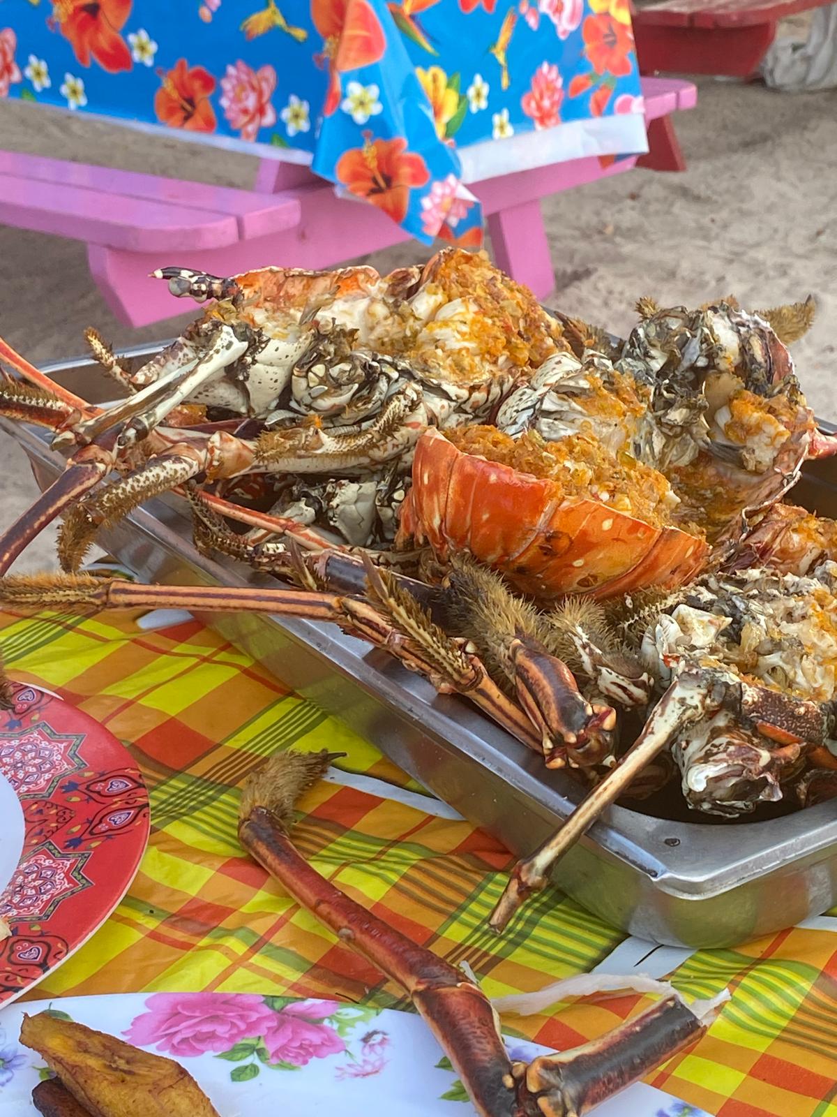 Demnach ist auch das Schwimmen nicht so leicht. Mir gelingt es kaum, trotz Schwimmflossen bei dem Boot zu bleiben. Das SUP bietet eine gute Möglichkeit, sich ein wenig zwischen den Inseln zu bewegen und einigen Schildkröten zu begegnen. Am Abend wollen wir ein Lobster-Barbeque bei Romeo genießen. Ich beschäftige mich noch damit, wo genau dieses stattfindet, da kommt uns Romeo schon auf einem Boot entgegen und Romeo teilt uns mit, dass wir eigentlich nur um die Insel Petit Bateau fahren müssen. Das klingt entspannt und die Vorfreude wächst.