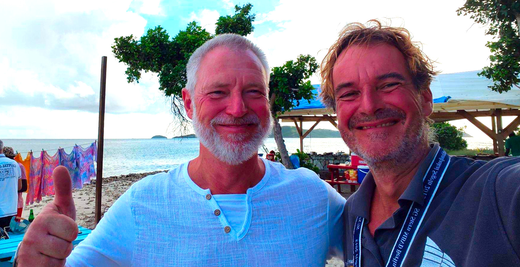 Mit dem Dinghi angelandet, bekommen wir unseren Platz an einem Tisch zugewiesen. Noch ein paar Fotos geschossen, die angebotenen Kleidungsstücke bewundert – da glaube ich, eine bekannte Stimme hinter mir zu vernehmen. Ich drehe mich um, und tatsächlich – mein ehemaliger Arbeitskollege und Regatta-Mitstreiter Olaf steht mit seiner Frau hinter mir. Unfassbar.
